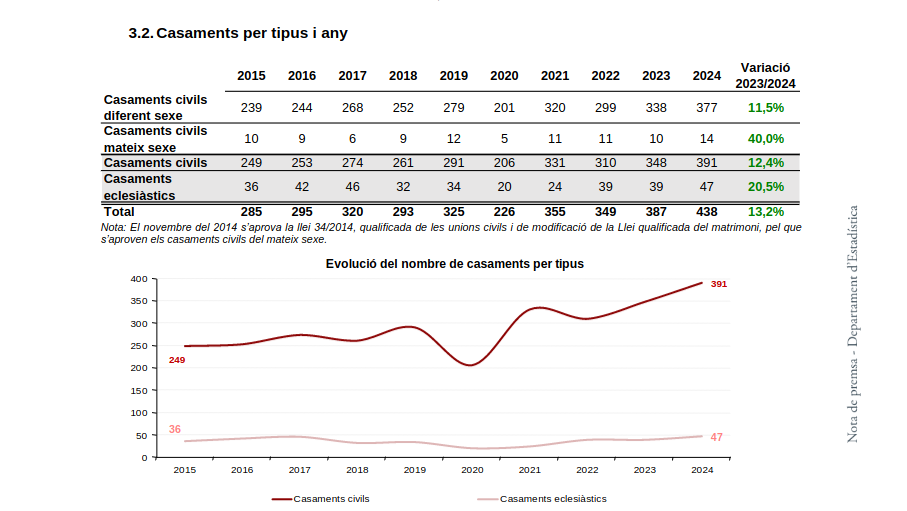 Durant l’any 2024, Andorra va registrar un total de 438 matrimonis, dels quals 391 van ser civils i 47 eclesiàstics, convertint aquest any en el que ha registrat més unions matrimonials de la història recent d'Andorra. Per altra banda, es van comptabilitzar 211 divorcis i 13 separacions.