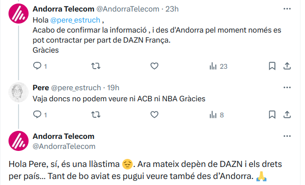 Aquesta limitació implica que els residents al país no poden accedir a continguts de DAZN Espanya, incloent-hi els drets de l’ACB o l’NBA, dues de les competicions esportives més seguides. “Vaja, doncs no podem veure ni ACB ni NBA”, lamentava l’usuari afectat. La resposta de la companyia no va deixar marge al dubte: “Sí, és una llàstima. Ara mateix depèn de DAZN i els drets per país… Tant de bo aviat es pugui veure també des d’Andorra”.