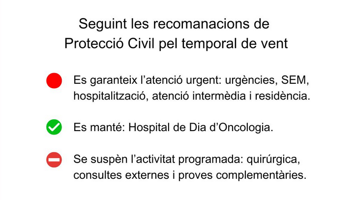 La Fundació Sant Hospital restringirà la seva activitat des de mitjanit fins a les 20 h, suspenent consultes externes, proves complementàries i activitats quirúrgiques programades, mentre que l’atenció urgent i l’Hospital de Dia d’Oncologia es mantindran operatius.
