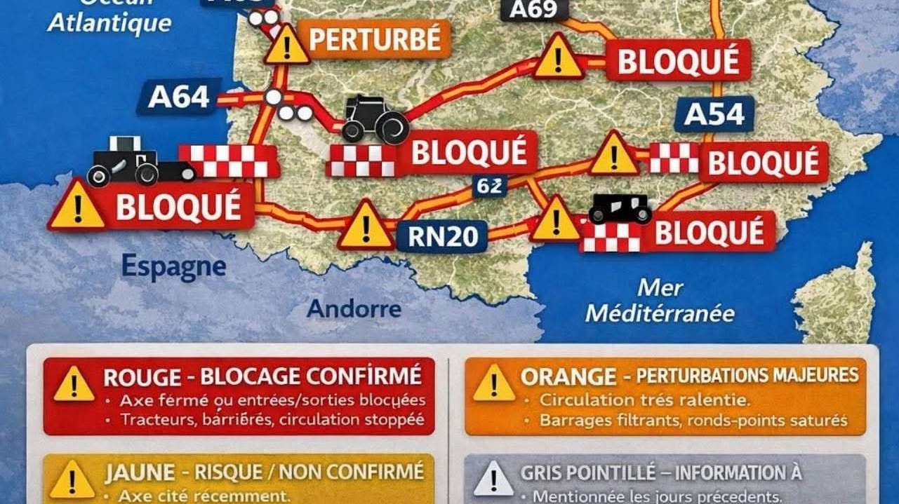 Entre Bordeaux i Bayona, l’A63 segueix parcialment oberta, mentre que una cinquantena de taxistes s’han afegit al moviment. Al Jura, a l’A39, alguns ramaders han optat per oferir un peatge gratuït en comptes de bloquejar completament la carretera, indicant que l’opció del bloqueig queda «a la reserva» per després de les vacances de Nadal.
