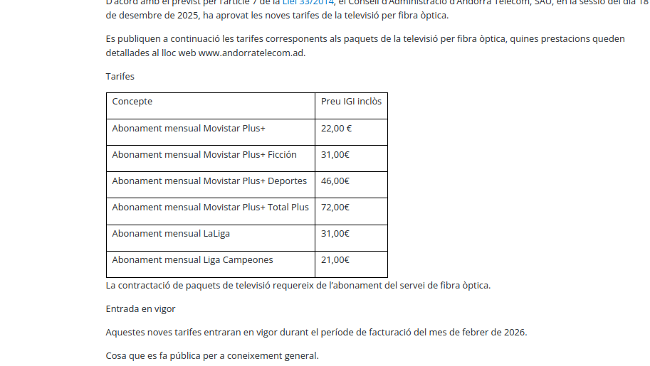 Andorra Telecom ha publicado las nuevas tarifas de los paquetes de televisión por fibra óptica, tras la aprobación del Consejo de Administración en la sesión del 18 de diciembre de 2025, de acuerdo con el artículo 7 de la Ley 33/2014.