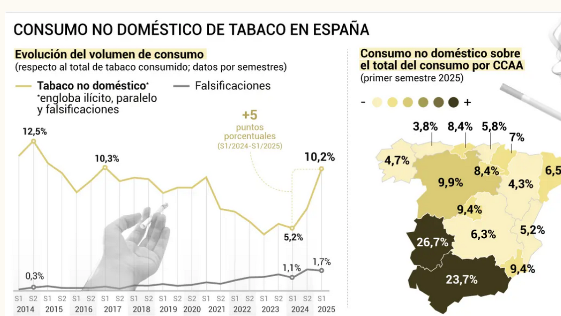 El consumo de tabaco no doméstico —es decir, aquel que no se vende oficialmente dentro del Estado— se ha disparado en España durante el primer semestre de 2025 hasta alcanzar el 10,2% del total, el doble que en el mismo periodo del año anterior (5,2%). Así lo revela la última Encuesta de Paquetes Vacíos (EPS), elaborada por la consultora Ipsos, que constata un cambio de tendencia después de casi una década de descenso constante.