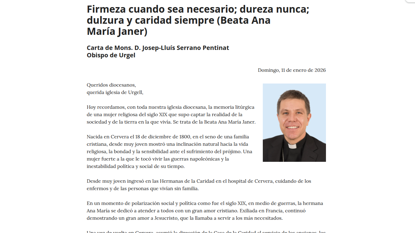 El copríncipe episcopal de Andorra y obispo de Urgell, Josep-Lluís Serrano Pentinat, ha dedicado su carta dominical a la beata Ana María Janer, coincidiendo con su memoria litúrgica.