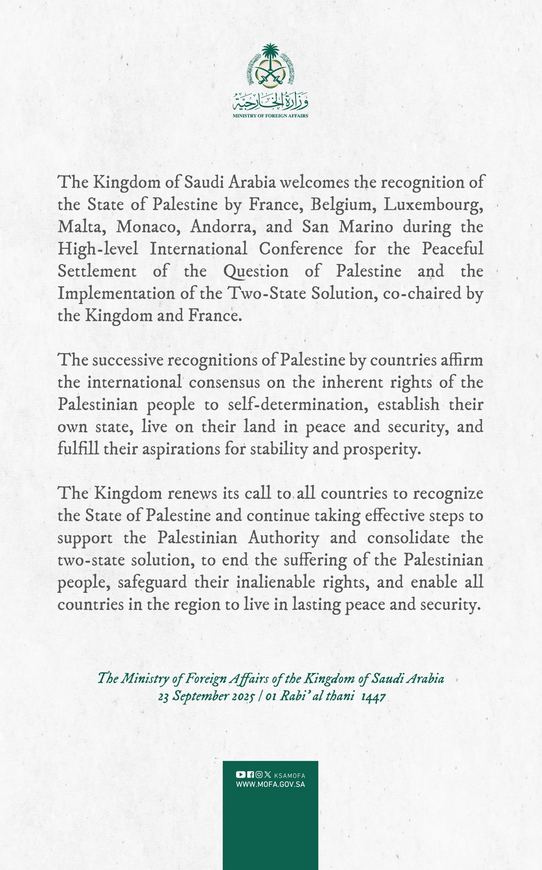El Ministerio de Asuntos Exteriores del Reino de Arabia Saudita emitió un comunicado este martes agradeciendo el reconocimiento oficial del Estado de Palestina por parte de Francia, Bélgica, Luxemburgo, Malta, Mónaco, Andorra y San Marino.