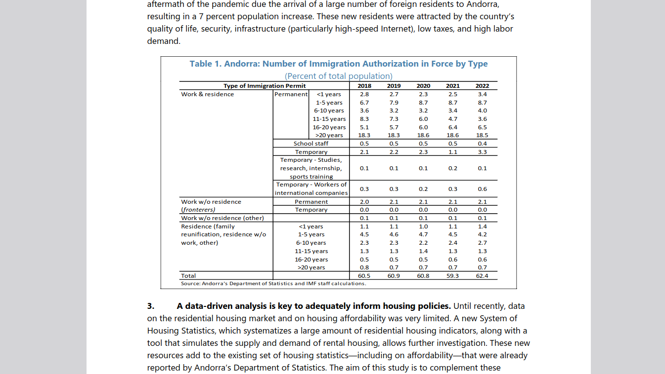 El estudio, incluido en los IMF Selected Issues Papers y elaborado por Ana Lariau y Michelle Tejada, señala que el aumento sostenido de los precios inmobiliarios y de los alquileres, sumado a los cambios demográficos y al modelo económico basado en la inmigración, ha generado un problema estructural de vivienda en el Principado.