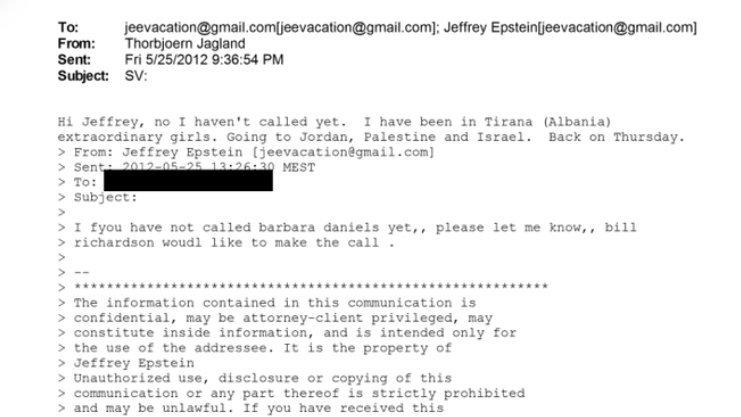 Uno de los correos más controvertidos está fechado el 25 de mayo de 2012, un día después de una visita institucional de Jagland a Albania. En el mensaje, dirigido directamente a Epstein, Jagland escribe: