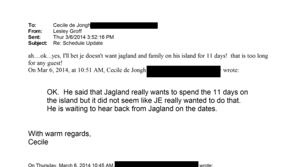 Dos años después, la documentación judicial incluye correos internos fechados entre marzo y abril de 2014 que reflejan la logística de una posible visita de Jagland y su familia a la isla privada de Jeffrey Epstein.