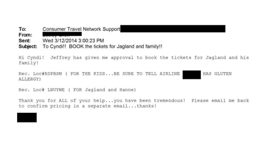 En abril de 2014, otros correos detallan preparativos adicionales: Jermaine Ruan fue designado para recoger a Jagland y a su familia el 15 de abril, y se compartió su número de teléfono para coordinar el traslado.