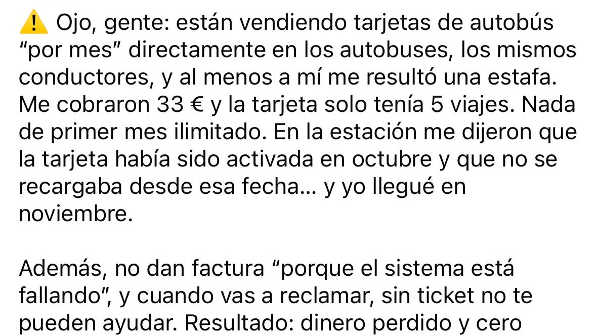 Una queja que circula en las redes sociales ha encendido las alarmas entre los usuarios del transporte público en Andorra. Según la publicación, se están vendiendo tarjetas de autobús “mensuales” directamente en los autobuses, cobrando 33 euros por un abono que supuestamente era ilimitado, cuando en realidad solo incluía 5 viajes.
