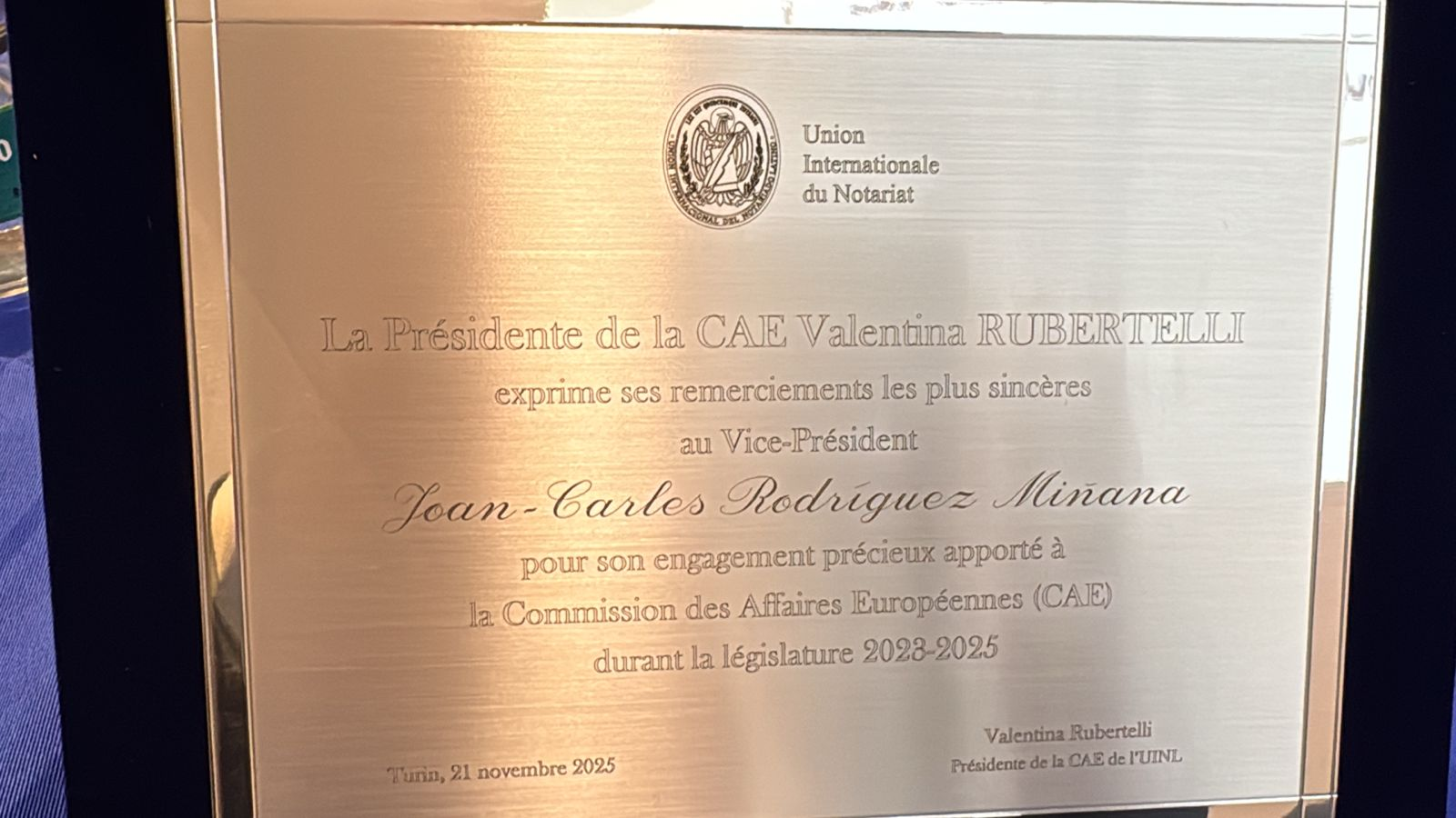 El notari andorrà Joan Carles Rodríguez Miñana ha estat reconegut a Torí per la seva trajectòria a la Comissió d’Afers Europeus del Notariat, on exerceix com a Vicepresident des del 2022, un càrrec que ha ostentat durant tota la legislatura i que li han demanat repetir, cosa que probablement farà.