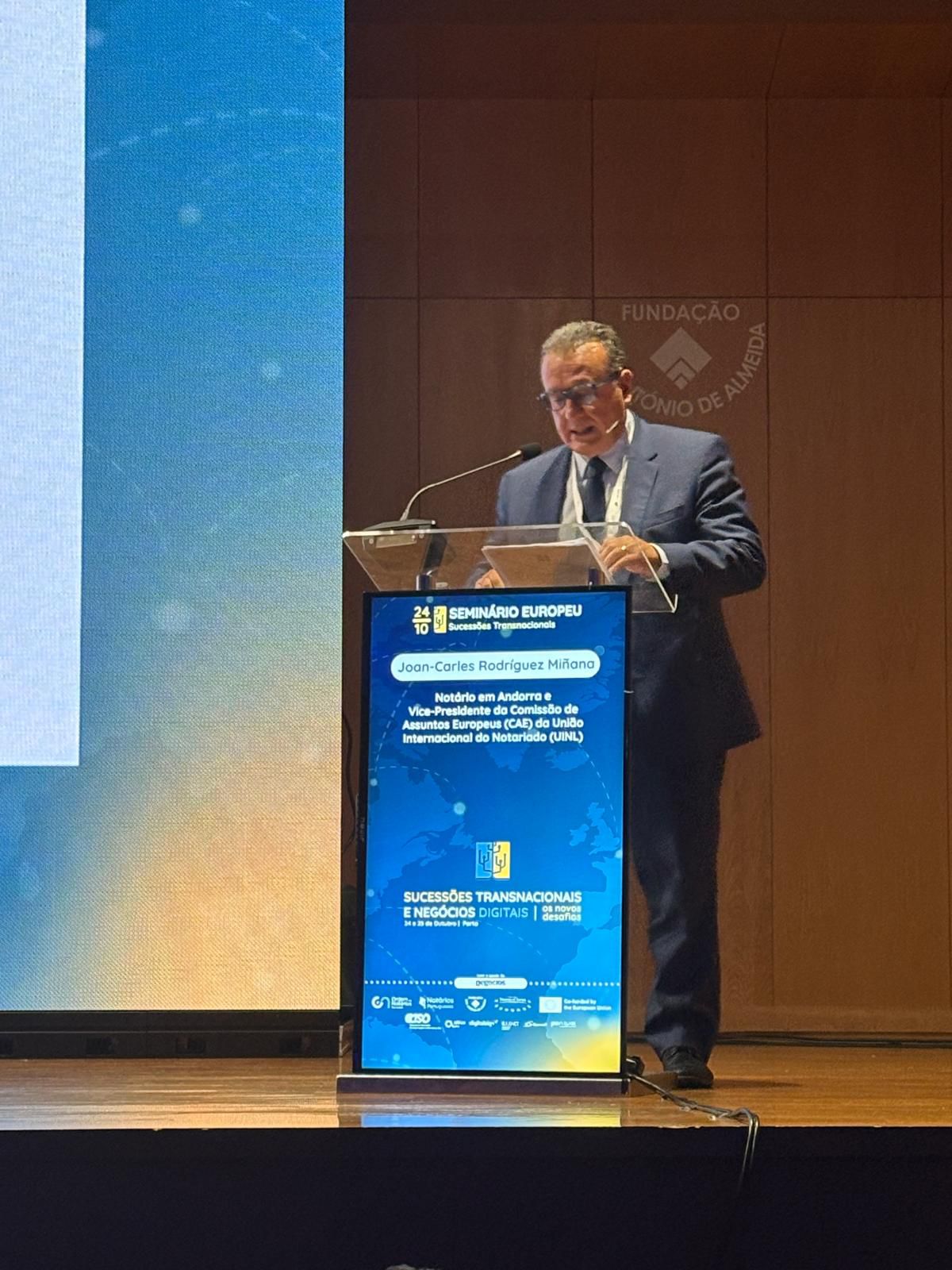 El notari Joan Carles Rodríguez Miñana, membre del Consell General de la Unió Internacional dels Notaris, està participant aquest divendres a Porto en una conferència centrada en l’excepció d’ordre públic en les successions europees, concretament en l’article 35 del Reglament (UE) n.º 650/2012.
