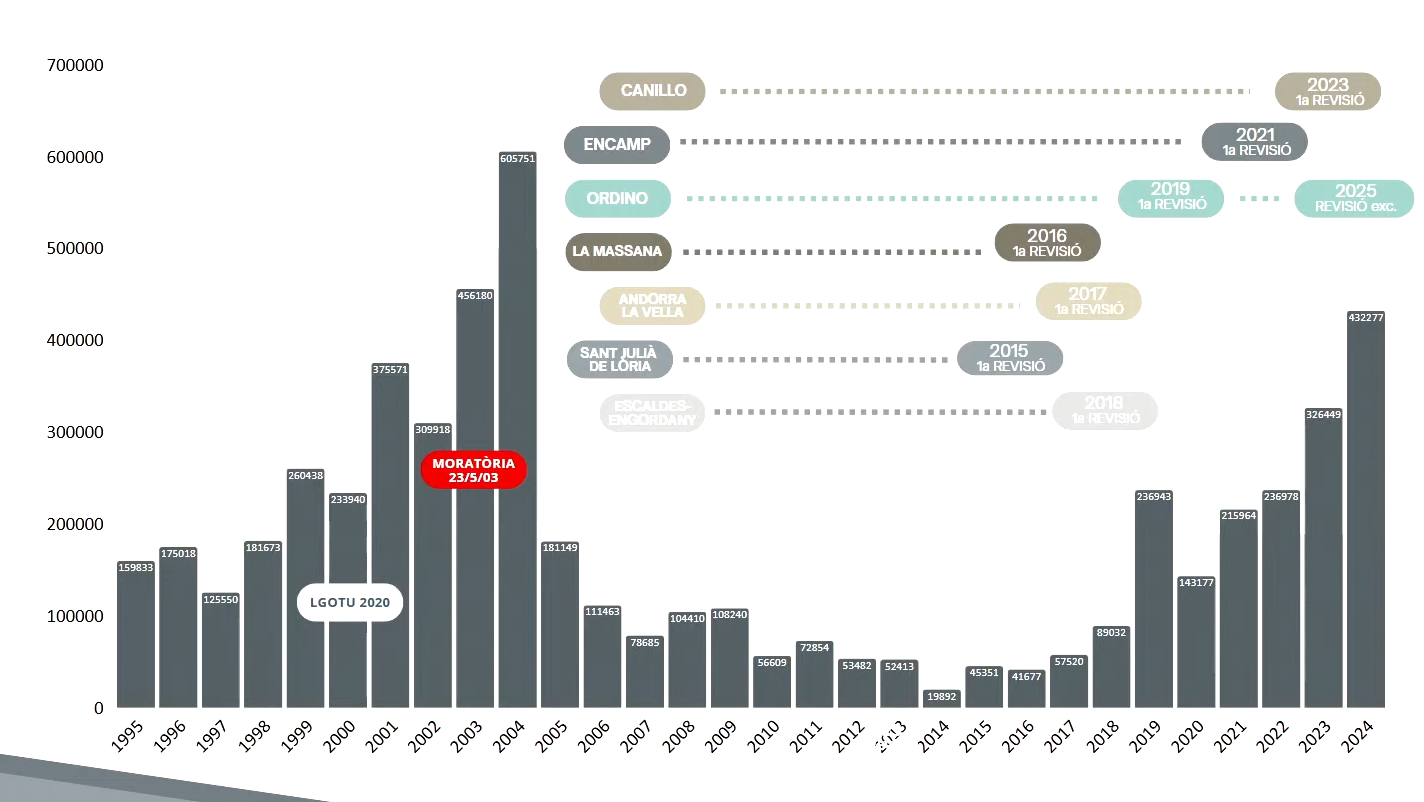 Després de la moratòria, hi va haver uns 14 anys d’estabilització, incloent la crisi del 2008-2012, amb pocs projectes nous, majoritàriament simbòlics. Durant aquest període, els comuns van aprovar els seus plans urbanístics (POUP), amb la primera revisió a partir de la recuperació econòmica i algunes segones revisions en curs, com és el cas d’Ordino, Andorra-la-Vella, Sant Julià o Escaldes-Engordany. La Massana ha adaptat el seu pla amb un nou sistema d’aigües de construcció, tenint en compte el creixement real de la parròquia.