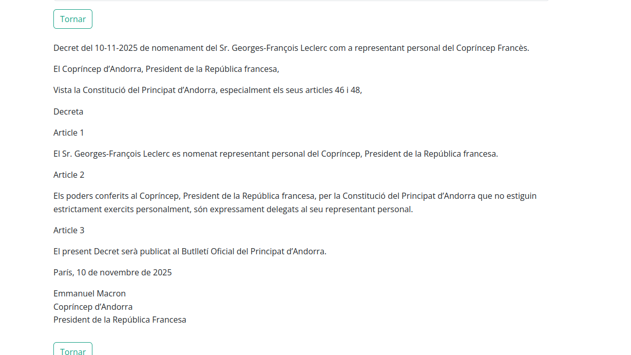 El copríncep d’Andorra i President de la República francesa, Emmanuel Macron, ha signat el decret del 10 de novembre de 2025 pel qual nomena Georges-François Leclerc com a nou representant personal del copríncep francès a Andorra. La informació del decret s'ha fet pública al Butlletí Oficial del Principat d’Andorra (BOPA).