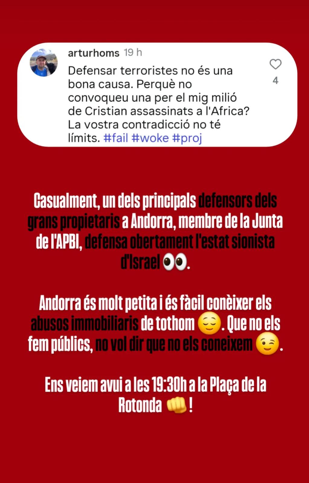 “Casualment, un dels principals defensors dels grans propietaris a Andorra, membre de la junta de l’APBI, defensa obertament l’estat sionista d’Israel. Andorra és molt petita i és fàcil conèixer els abusos immobiliaris de tothom. Que no els fem públics no vol dir que no els coneguem.”