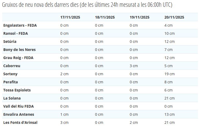 Us adjuntem també la primera taula de neu nova de la temporada, que confirma el bon inici d’hivern i deixa entreveure unes condicions favorables per a l’obertura progressiva de les estacions d’esquí durant els pròxims dies.