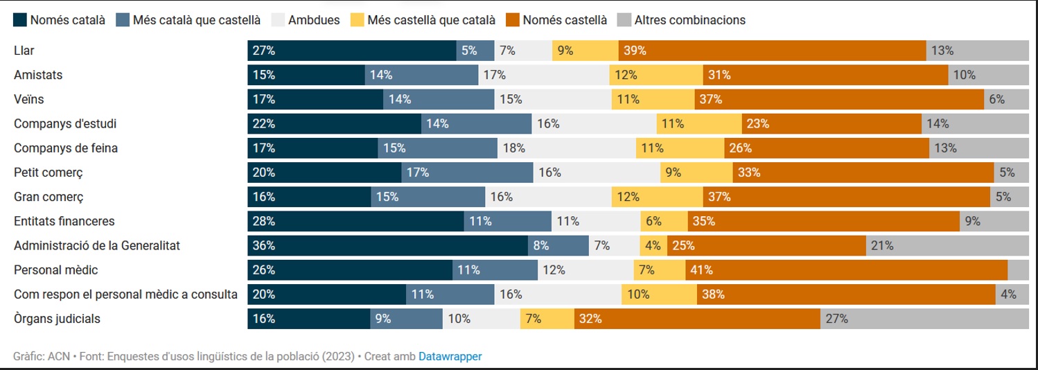 L’únic àmbit que supera el 30% és el personal de l’administració de la Generalitat (36%). Paral·lelament, l’ús exclusiu del castellà ha augmentat en gairebé tots els àmbits, arribant fins al 41% en el personal mèdic i al 37% en grans centres comercials.