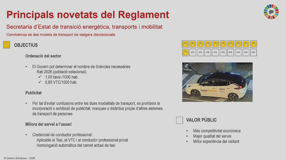 Segons ha explicat el membre de l'Executiu, la mesura situarà la flota en uns 120 a 130 vehicles de taxi circulant pels carrers de Andorra, amb l’objectiu de millorar la cobertura del servei i reforçar el transport públic en l’àmbit urbà i interurbà.