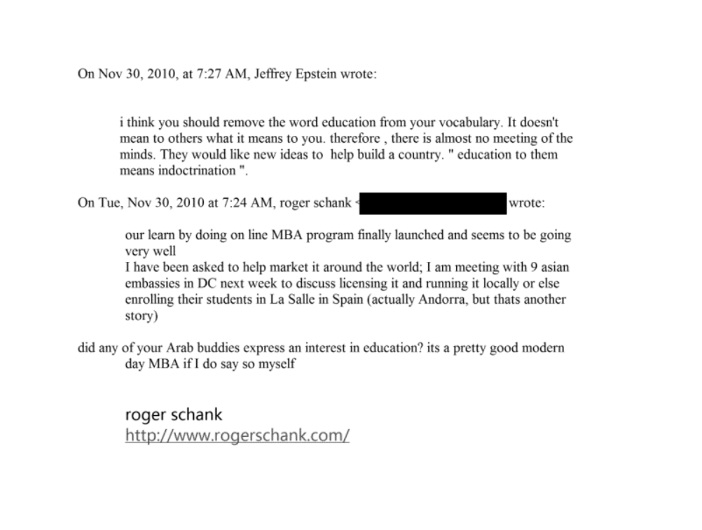 En el mateix intercanvi, Roger Schank pregunta de manera explícita a Epstein si “alguns àrabs volen ajuda per ensenyar els joves a dirigir o treballar en una empresa”, reforçant la idea que el programa MBA online es concebia com una eina d’exportació educativa orientada a mercats emergents i governs estrangers.