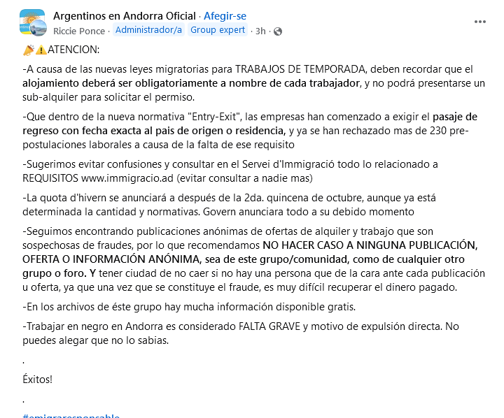 L’associació Argentinos en Andorra ha emès una alerta important dirigida als ciutadans del seu país que preveuen venir a treballar a Andorra durant la temporada d’hivern.