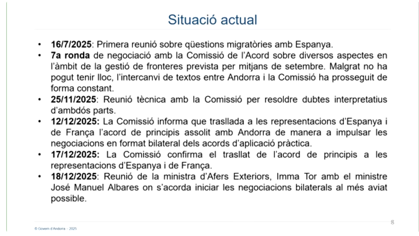 En conjunto, estas gestiones reflejan que, pese a los retrasos formales en las negociaciones con la Comisión Europea, Andorra mantiene un diálogo activo con la UE, España y Francia. El Ejecutivo defiende que se garantiza la normalidad en las autorizaciones temporales y el correcto desarrollo de la temporada turística, mientras la oposición reclama mayor celeridad y transparencia en el proceso.