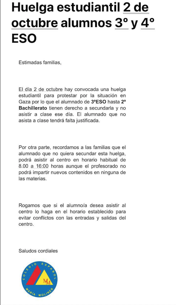 El Colegio Español Maria Moliner ha informado a las familias sobre la convocatoria de una huelga estudiantil prevista para el próximo 2 de octubre, motivada por la situación en Gaza.