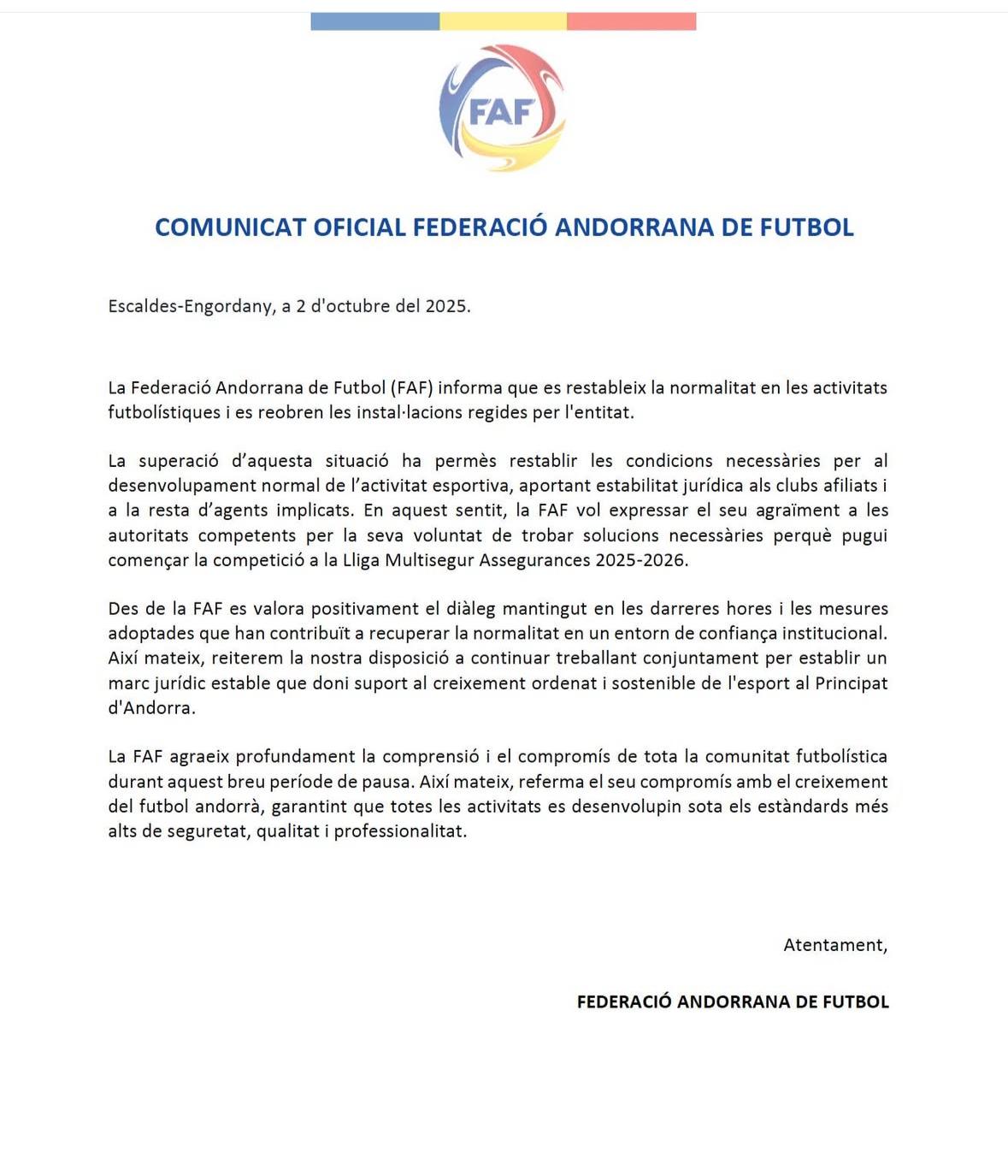 Con esta resolución, la federación pone fin a un episodio que había provocado incertidumbre en el fútbol andorrano y envía un mensaje de retorno a la normalidad competitiva e institucional.